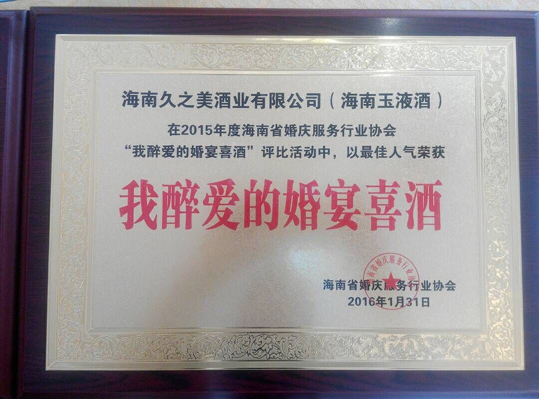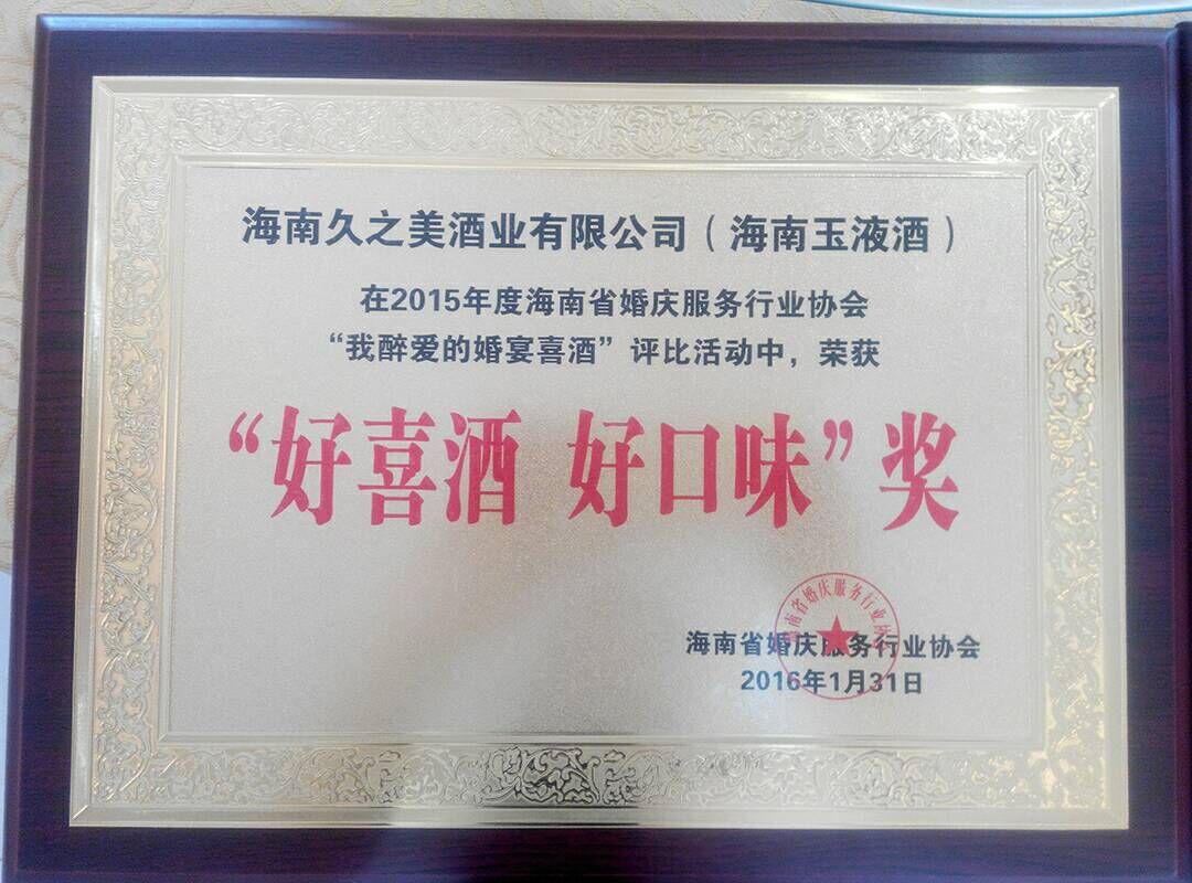 海南久之美酒業有限公司(海南玉液酒)榮獲海南省婚慶服務行業協會頒發的2015年海南省“我醉愛的婚宴喜酒”牌匾以及“好喜酒 好口味”獎牌。