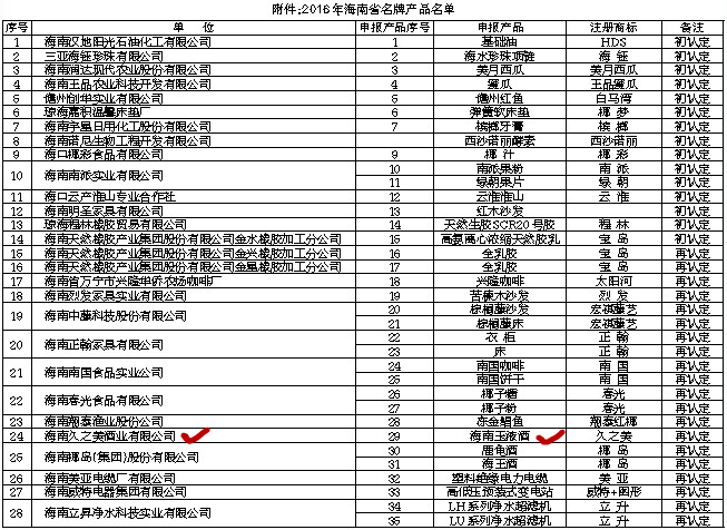 海南省名牌產(chǎn)品認(rèn)定委員會(huì)在2016年9月9日的海南日?qǐng)?bào)上公布了被認(rèn)定為“2016年海南省名牌產(chǎn)品”的28家企業(yè)的35個(gè)產(chǎn)品,海南久之美酒業(yè)有限公司出品的“海南玉液酒”名列其中。 當(dāng)日公告如下:
