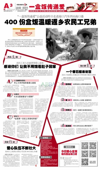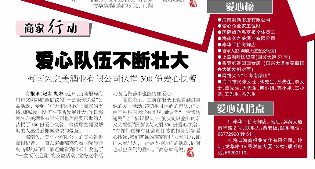 海南久之美酒業有限公司的高總告訴商報記者,一直以來她都喜歡看國際旅游島商報的新聞,最近她看到報紙上發出了"一盒飯傳遞愛"的公益活動,覺得這個活動既是做善事也能傳遞愛心.